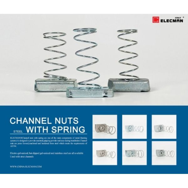 ELECMAN ® Galvanized steel strut channel clamping nut with regular springs are one of the main components of metal framing system.it is designed to provide essential gripping powder and ease during installation.Channel nuts are press formed,machined and hardened from steel which meets the requirements of ASTM.