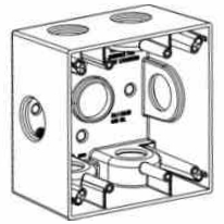 | 2G50-5 | 1/2" | 5 outlet holes Aluminum die cast Width:4-9/16" Height:4-1/2" Depth:2" Volume:30.5 cu.in. | ![]() | 2G50-7 | 1/2" | 5X-config outlet holes Aluminum die cast Width:4-9/16" Height:4-1/2" Depth:2" Volume:30.5 cu.in. | ![]() |